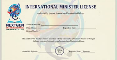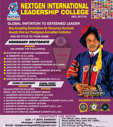 NextGen International Leadership College is a global Christian training institution committed to equipping emerging and established leaders with sound biblical education, transformational leadership skills, and practical ministry competence. As a newly registered Bible College with a global vision, the institution provides accessible, high-quality theological and leadership training that prepares believers to influence the Church, society, and the nations for Christ. Rooted in Scripture and guided by the Holy Spirit, NextGen College exists to raise leaders who embody integrity, spiritual maturity, academic excellence, and a passion for kingdom impact.